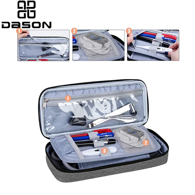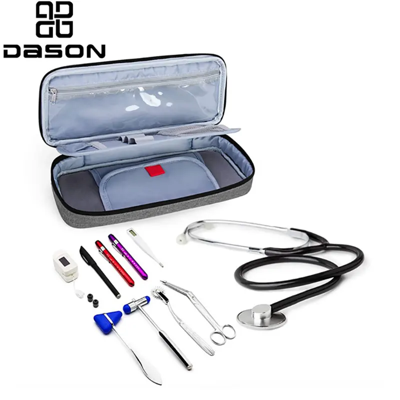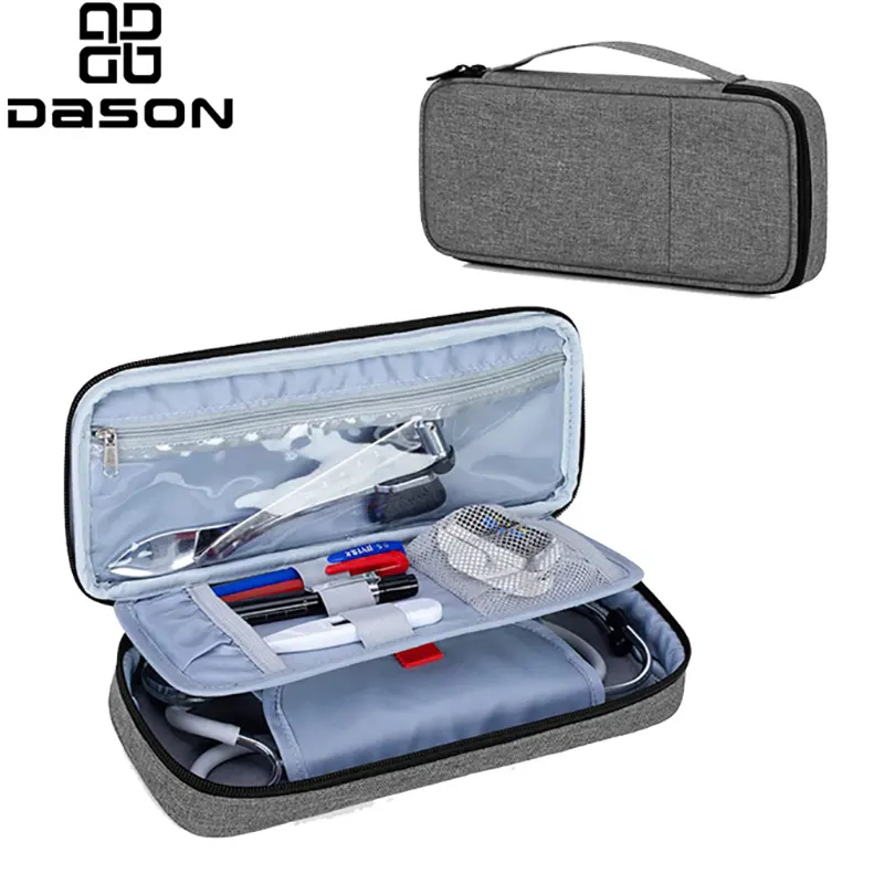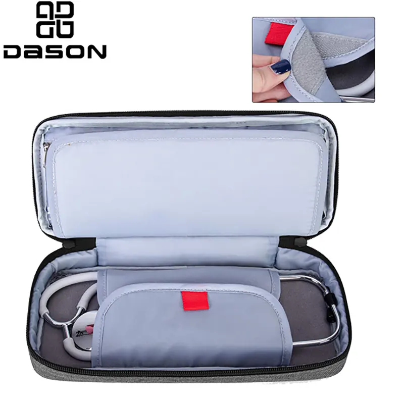 Nurse Stethoscope Case è una custodia portatile per stetoscopio appositamente progettata per gli infermieri. Poiché gli infermieri spesso hanno bisogno di trasportare stetoscopi, metterli in scatole può danneggiarli durante il trasporto. La custodia dello stetoscopio è realizzata in materiale plastico liscio e resistente per resistere all'usura e agli urti dovuti all'uso regolare. L'interno contiene una morbida imbottitura che garantisce che lo stetoscopio non possa essere graffiato o danneggiato da oggetti esterni, impedendo allo stesso tempo l'ingresso di impurità e macchie nello stetoscopio. La custodia dello stetoscopio è realizzata in morbido tessuto di poliestere con fodera 210D e cerniera liscia. Ha una partizione interna e ha una buona resistenza agli urti e all'acqua. Contiene un supporto interno rimovibile, che può proteggere efficacemente lo stetoscopio da urti e graffi. All'interno è presente una borsa a rete che può contenere piccoli articoli medici; ci sono anelli elastici sulle partizioni per riporre penne, termometri, ecc. Design con doppia cerniera per una facile apertura e chiusura. La borsa è compatta e leggera, quindi può essere facilmente riposta nello zaino. Il design della maniglia portatile offre comodità per studiare e lavorare all'aperto. La custodia per stetoscopio da infermiera è uno strumento pratico per tutti gli infermieri. È leggero e portatile, può ospitare la maggior parte degli stetoscopi e ha la funzione di proteggere lo stetoscopio, identificare l'area di identificazione e prevenire la contaminazione esterna.